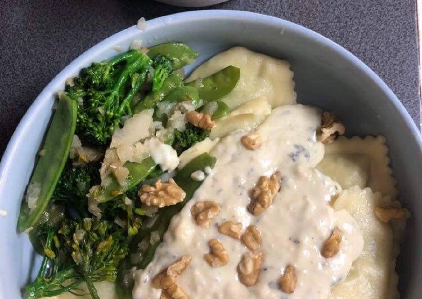 - Mettre les raviolis dans une assiette versez la sauce par-dessus et servir avec vos légumes. Décorer avec vos noix