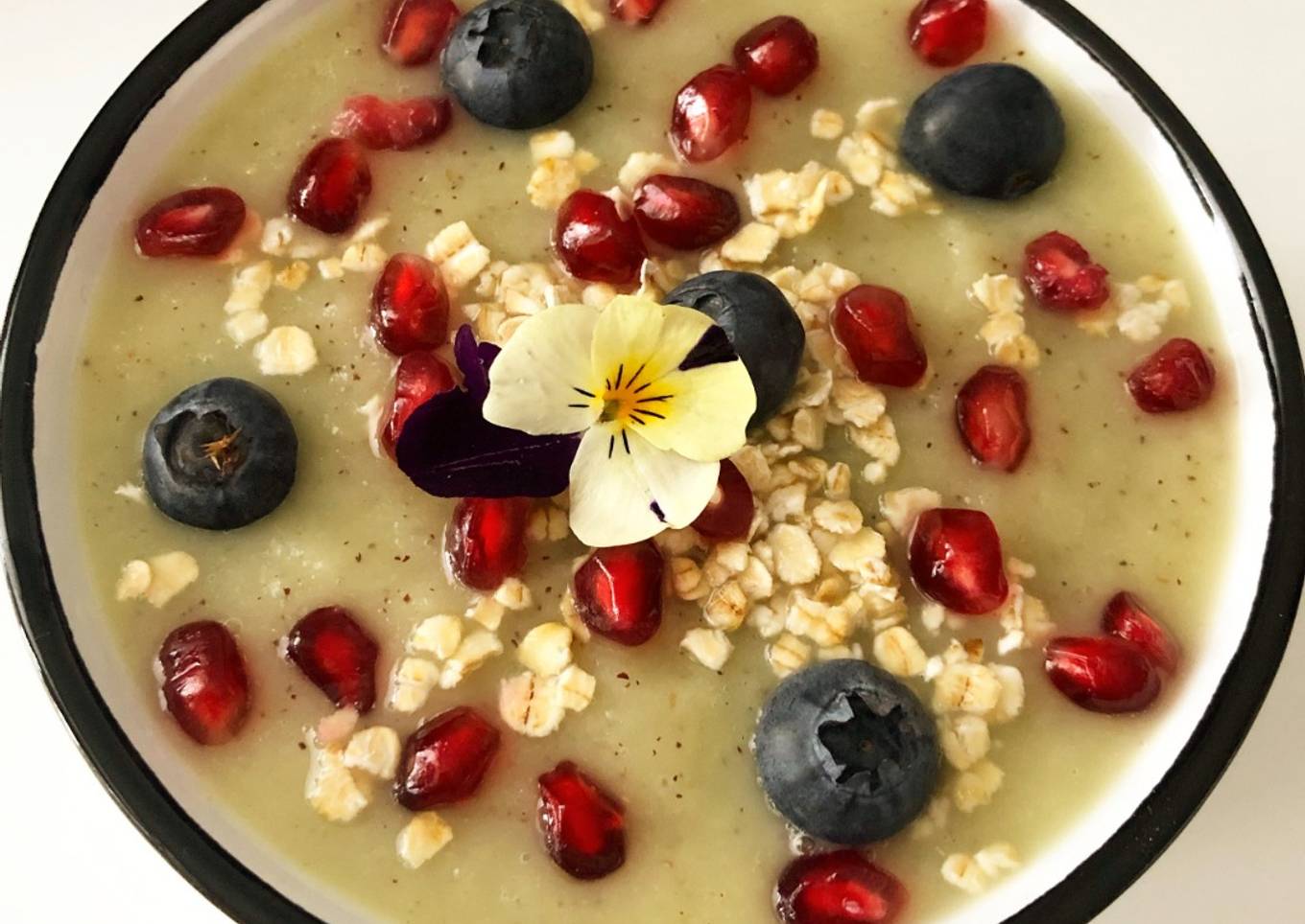 - Verser le smoothie dans un bol et disposer par dessus les flocons d'avoine, les myrtilles et les graines de grenade.